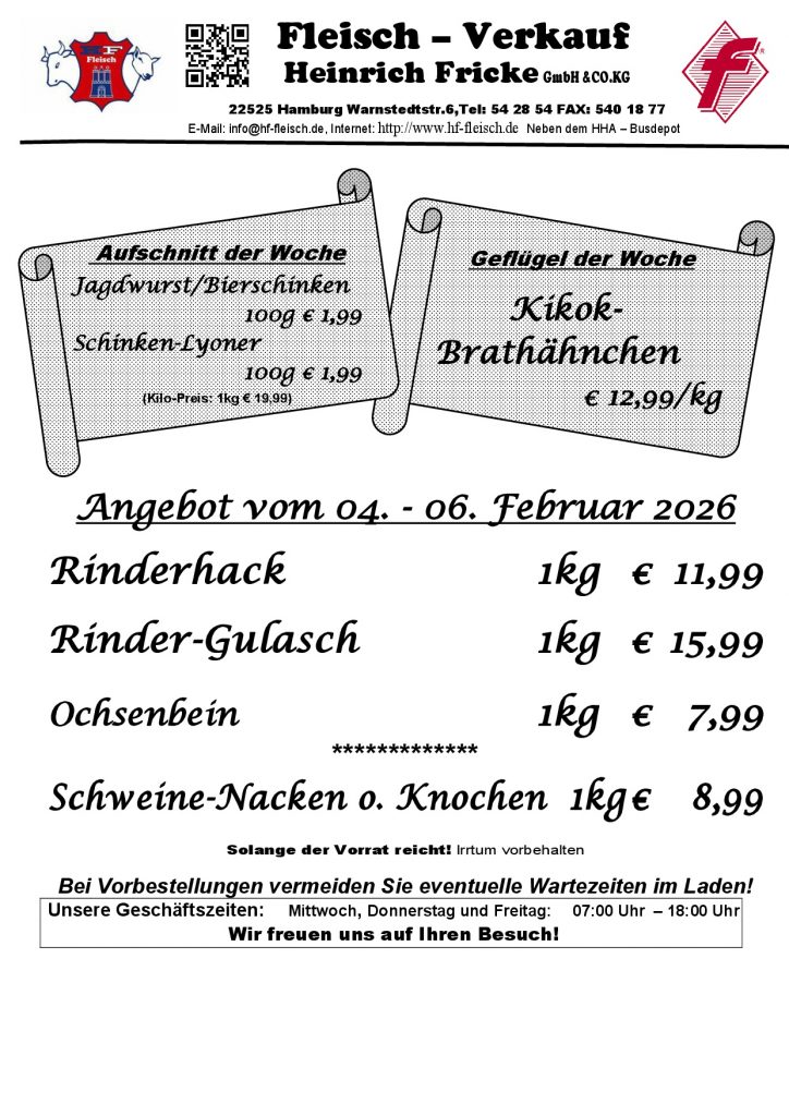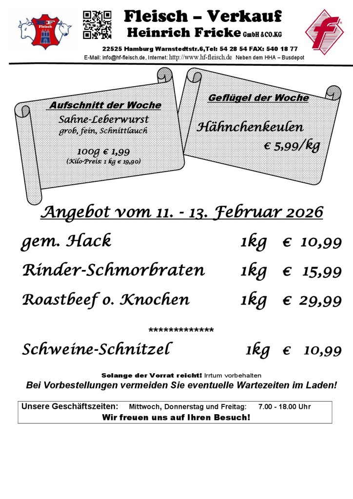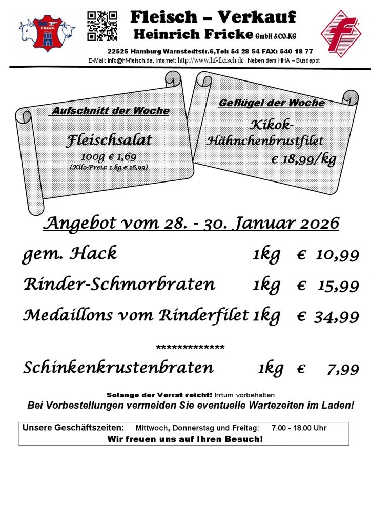 HEINRICH FRICKE GmbH & Co. KG EG - Schlacht/- und Zerlegebetrieb seit 1977 Hamburger Familienbetrieb seit 1892 Regionale Spitzenqualität - VERKAUF vor Ort! ANGEBOTE der woche in unserem Ladengeschäft: MI, Do + Fr von 7 - 18 Uhr Direkt hier bestellen